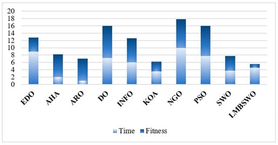 In this section, we focus on a comprehensive analysis of the two most important metrics when the algorithm solves the OAPP for mobile robots to weigh the reliability and practicality of the algorithm. Figure 9 shows a stacked plot of the algorithm’s average path length rankings and average runtime rankings when running path planning for the five map environments, where larger values on the Y-axis indicate poorer comprehensive algorithm performance. As can be seen from the figure, the LMBSWO corresponds to the lowest column height, which indicates that, compared to other excellent algorithms, the LMBSWO-based OAPP method strikes a better balance between the two metrics of path length and runtime. As can be seen from the figure, the KOA and ARO are ranked second and third, respectively. Although the KOA and ARO are better than the LMBSWO in the runtime metrics, they are much weaker in the path length metrics, which suggests that the overall performance of the LMBSWO is better than that of the KOA and ARO. Meanwhile, due to the introduction of learning strategies in the LMBSWO, the runtime of the LMBSWO is higher than that of the SWO, but the LMBSWO can obtain better robot paths, and it is feasible to sacrifice some of the time and thus trade for better paths. Therefore, we believe that the LMBSWO proposed in this paper has the strongest comprehensive solution performance and consider the LMBSWO as a promising OAPP method for mobile robots.