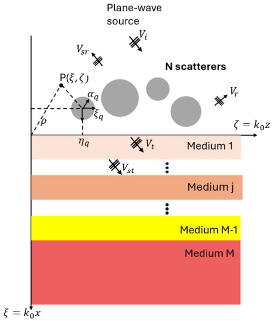 We examine the geometry of the scattering scenario depicted in Figure 1. N cylindrical dielectric or conducting rods with circular cross-sections are positioned on the top of a multilayered structure. The structure extends infinitely along the y-axis. We analyze a layout with a multilayer embedded between two dielectric half-spaces, namely, medium 0 and medium M. Medium 0 is occupied by the vacuum with permittivity , while the media from 1 to M are linear, isotropic, and homogenous media having permittivity () and conductivity . The j-th layer () has a thickness of . Within medium 0, N scatterers are positioned along the y-axis. We consider a primary reference frame () with normalized coordinates and , where represents the vacuum wavenumber. Additionally, N local reference frames, centered on the axis of the t-th cylinder, are introduced. These frames utilize both Cartesian () and polar () coordinates, where , , and .