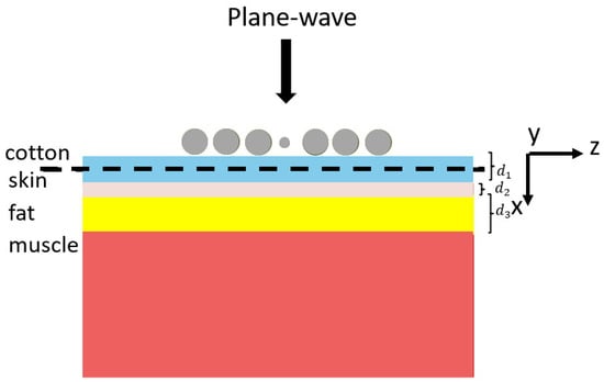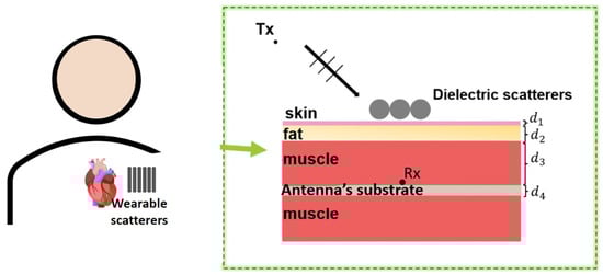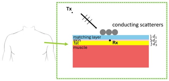 A different case is considered for N metallic cylinders (perfectly electric conductor, PEC) placed above the multilayer shown in Figure 16. A textile layer of thickness , a skin layer of thickness and a fat layer of thickness are considered. A receiving antenna is assumed to be positioned in the middle of the skin layer.