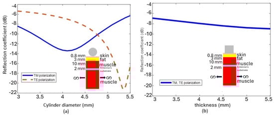 Here, we conducted a preliminary study using the commercial electromagnetic simulator CST Microwave Studio to investigate and optimize the case where a periodic array of cylindrical scatterers lies on a multilayer structure. The cylinders have dielectric constant . The unit cell is simulated to study the reflection coefficient in the case of TM polarization (incident electric field directed along the cylinder axis) and TE polarization (magnetic field directed along the cylinder axis). The thicknesses of the layers are assumed as follows: mm, mm, mm, and mm. Figure 3a shows the reflection coefficient as a function of the scatterer diameter for both polarizations. The analyzed unit cell is shown in the insert. The reflection coefficient in the case where the scatterer has a rectangular shape (continuous case) is shown in Figure 3b for TM and TE polarization. It can be seen that a better transmission is obtained in the case of the circular scatterer.