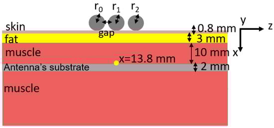 Configuration with dielectric cylinders (), with the same radii ( mm), positioned above a layer of skin, fat, muscle, and a layer mimicking a tumoral inclusion (of thickness mm).