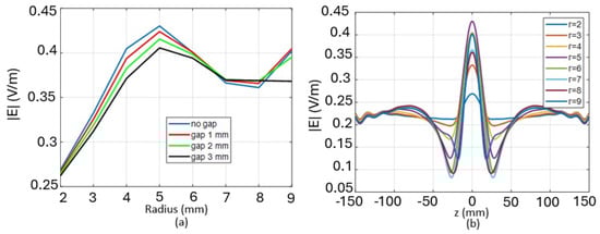 As a second step, a finite number of cylindrical scatterers is considered, as shown in Figure 4, where dielectric cylinders of radius , , and spaced by a gap are positioned above the multilayer with the same configuration illustrated in Figure 2. Figure 5a shows the magnitude of the electric field evaluated at mm as the radius of the scatterers changes and for several gap configurations obtained with the present analytical approach. It can be observed that the maximum electric field value is obtained for the ‘no gap configuration’. For this configuration, the horizontal electric field profile along the z-direction at mm is shown in Figure 5b for several radius values. An intensification around 6 dB is observed in the case where the cylinders have radius mm. This is also clearly visible in Figure 6, where the electric field map is shown in (a) and the vertical field profile along the entire multilayer is shown in (b). At the interface between the muscle and the antenna substrate, the intensification is evident.