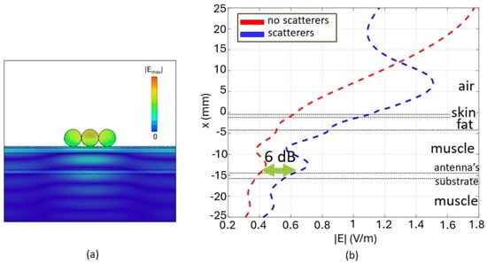 As a final study, a configuration with conducting cylindrical scatterers is considered. They are placed above a layer of cotton with dielectric constant , skin, fat, and muscle. The thicknesses are mm, mm, mm (Figure 20). The permittivity values are the same as those used in previous cases. The outer cylinders have radius mm and the inner one has a radius of mm. In this case, we are interested in observing what happens in mid-cotton, where, for example, a wearable antenna could be placed. Figure 21a shows the horizontal profile of the magnetic field in the middle of the cotton layer in the case where the scatterers are present and absent. Figure 21b shows the vertical profile of the magnetic field along the multilayer. Also, in this case, an intensification of 3 dB is observed.