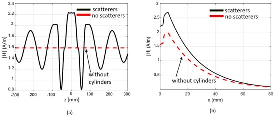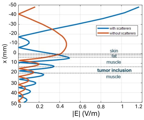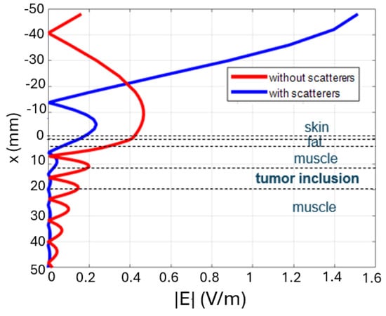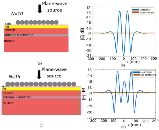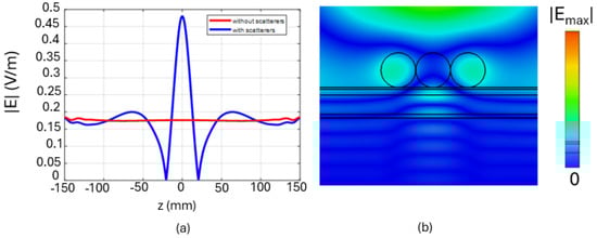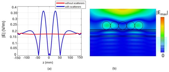 Configurations with an increased number of scatterers are considered as illustrated in Figure 7, where the comparison between the case where scatterers are present and the case where they are absent is presented. In particular, in Figure 7b–d, the horizontal profile of the electric field at mm is shown. In the case where the number of scatterers is , two peaks of the electric field are observed, while in the case where , we observe three different peaks.
