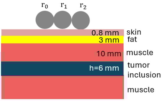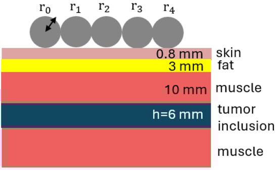 Configuration with dielectric cylinders (), with the same radii ( mm), positioned above a layer of skin, fat, muscle, and a layer mimicking a tumor inclusion (of thickness mm).