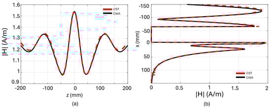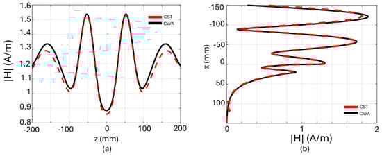 Comparison between the analytical method CWA and CST: (a) Horizontal profile of the magnetic field at a depth of mm; (b) vertical profile of the magnetic field along the multilayer, mm.