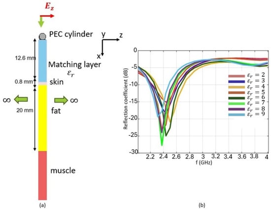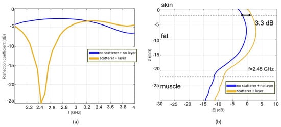 Also in this case, as described in Section 3.1 for the dielectric scatterers, we conducted a preliminary study to optimize a periodic array of PEC scatterers whose unit cell is shown in Figure 17a. The unit cell consists of a layer, for now called a ‘matching layer’, of thickness mm and dielectric constant , a layer of skin ( mm), a layer of fat ( mm), and a semi-infinite layer of muscle. Figure 17b shows a parametric study on the dielectric constant of the matching layer between the scatterers and the skin. Around the frequency of GHz, the best solution is obtained for a dielectric constant of . Therefore, considering this permittivity value, in Figure 18a, the reflection coefficient of the analyzed unit cell is reported in the case where both the scatterer and the matching layer are present and in the case where both are absent. Figure 18b shows the vertical profile of the electric field along the multilayer. At the interface between skin and fat, we observe an intensification of 3.3 dB.