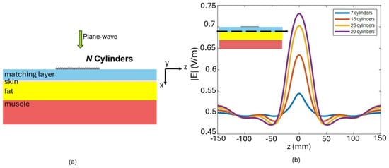 Subsequently, the case with a finite number N of conducting cylinders, shown in Figure 19, was analyzed. N conductor cylinders lie on the same multilayer configuration shown in Figure 17a. Figure 19b shows the horizontal profile of the electric field in the middle of the skin layer evaluated for scatterers.