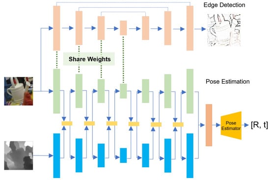The edge attention mechanism is implemented through an edge detection network branch that shares weights with the bidirectional feature fusion network. This integration ensures that the network gets edge attention, thereby enhancing the accuracy of pose estimation. The architecture of the edge detection network mirrors that of the RGB branch of the bidirectional feature fusion network, utilizing a ResNet34 [] encoder pre-trained on ImageNet [] and a PSPNet [] decoder. This consistent architecture facilitates joint training and weight sharing, which is critical for the simultaneous optimization of both networks.