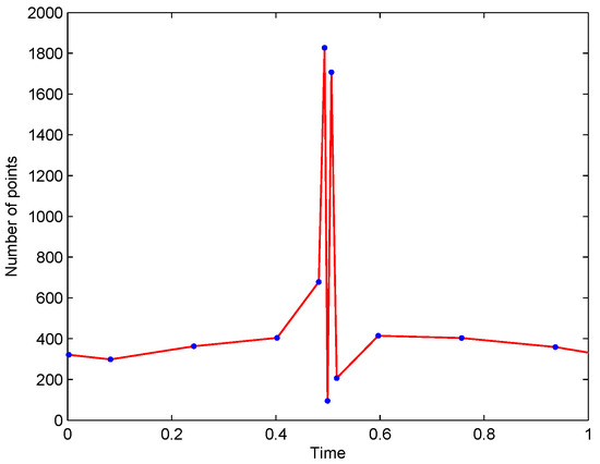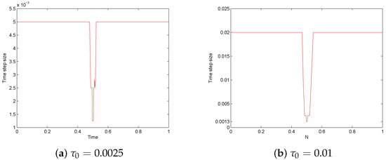 For Algorithm 1, we choose in Example 1 and give some specific cases of time-step adaptation. Firstly, we constrain the time step to be extended only once when the time step is too small at each time step. Figure 1 shows the number of nodes and the time step size at each time step n with , respectively, when and . We note that the time step size drops in a small time interval around and is constant in the rest of the interval. It is not a surprise, as changes exponentially from to 0 and then from 0 to around . The ratio of the maximum time step size to the minimum is when . That means the efficiency of the adaptation can increase by an order of magnitude. Then, Figure 2 shows the number of nodes of at each time step when , , and without the constrains on the number of time extensions.