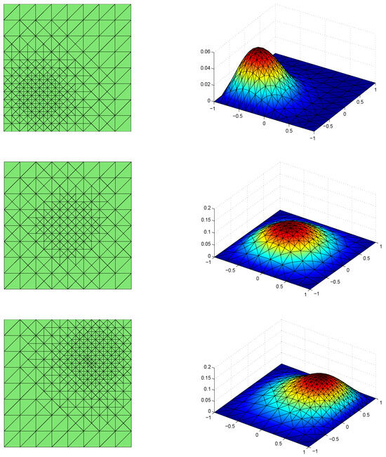 Surface plots of discrete solutions (right) and the corresponding meshes (left) at (from top to bottom). The numbers of nodes of the meshes are for , respectively.