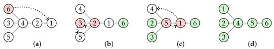 Illustration of . (a) Homing , swaps = 3. (b) Homing the star leaf marker 2 followed by 3, swaps = 2. (c) Homing followed by 1, swaps = 2, (d) sorted broom. Total number of swaps = 7.