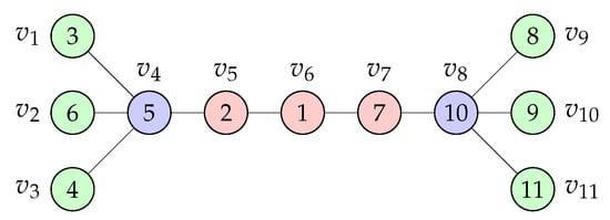 - Suppose s is in a path vertex and suppose that there exists a sequence of star leaf markers from other brooms in the adjacent vertices of s. It will then be swapped with all of these markers according to step 3 of . Keep in mind that these markers are moving closer to the center of the . This means that s is swapped closer to the star , which means it is moving closer to its home. At the end of this swap sequence, s will reach the center of the star and will become homed, as we discussed in Case 1.