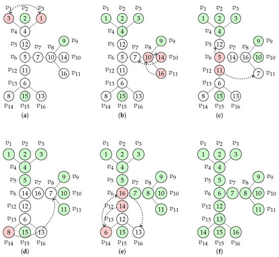 Illustration of . (a) Solving the independent (star) formed by , swaps = 3. (b) Homing the star leaf marker 10 and moving the markers 14 and 16 to the path, swaps = 3. (c) Homing the maximum clear path marker 5 followed by 11, swaps = 5. (d) Homing the maximum clear path marker 8, swaps = 5. (e) Homing the maximum clear path marker 6 followed by 14 and 16, swaps = 6. (f) Sorted .