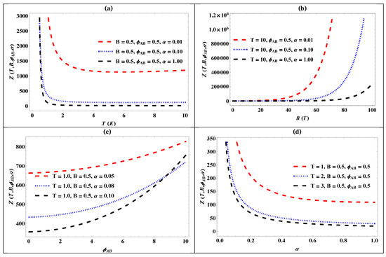 The variation of the Z(β) for the generalized pseudo-harmonic oscillator against (a) temperature for different values of the screening parameter (); (b) the magnetic flux for different values of the screening parameter (); (c) the AB flux () for different values of the screening parameter (); and (d) the screening parameter () for different values of temperature (T).