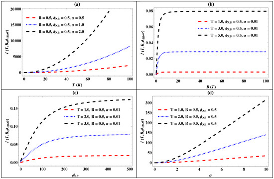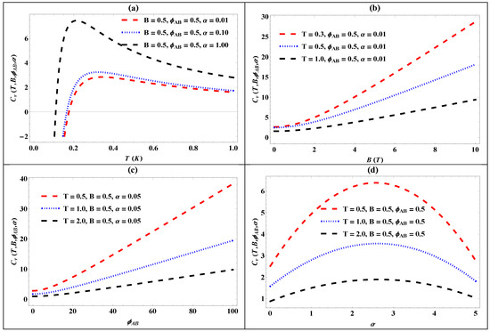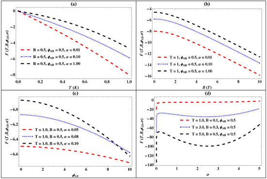 Figure 2a–d present the plots depicting the Helmholtz free energy versus temperature (T), the magnetic field (B), the AB flux (), and the screening parameter (). In Figure 2a, the Helmholtz free energy increases with rising screening parameters at increasing temperatures. Figure 2b shows how the Helmholtz free energy varies with the magnetic field for a fixed temperature and AB flux, highlighting that an increase in the screening parameter leads to higher free energy as the magnetic field rises. Figure 2c presents the relationship between the Helmholtz free energy and AB flux for a constant temperature and magnetic field, demonstrating an increase in free energy with increasing screening parameters. Figure 2d depicts the variation of free energy with screening parameters at a constant temperature and AB flux for different magnetic field strengths, indicating a decrease in free energy as the magnetic field intensity rises. These figures collectively depict the dependencies of the Helmholtz free energy on temperature, the magnetic field, the AB flux, and the screening parameter, which provides insights into the thermodynamic properties of the system under investigation.