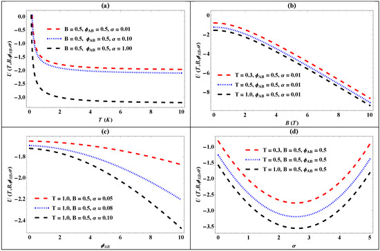 The plot of internal energy for the generalized pseudo-harmonic oscillator against (a) temperature for different values of the screening parameter (); (b) the magnetic flux for different values of the screening parameter (); (c) the AB flux () for different values of the screening parameter (); and (d) the screening parameter () for different values of temperature ().