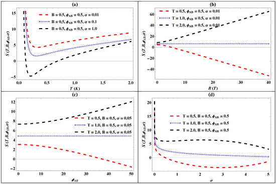 The plot of entropy for the generalized pseudo-harmonic oscillator against (a) temperature for different values of the screening parameter (); (b) the magnetic flux for different values of the screening parameter (); (c) the AB flux () for different values of the screening parameter (); and (d) the screening parameter () for different values of temperature ().