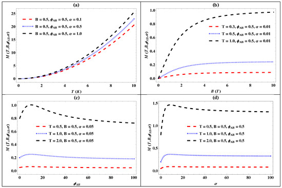 The plot of magnetization for the generalized pseudo-harmonic oscillator against (a) temperature for different values of the screening parameter (); (b) the magnetic flux for different values of the screening parameter (); (c) the AB flux () for different values of the screening parameter (); and (d) the screening parameter () for different values of temperature ().