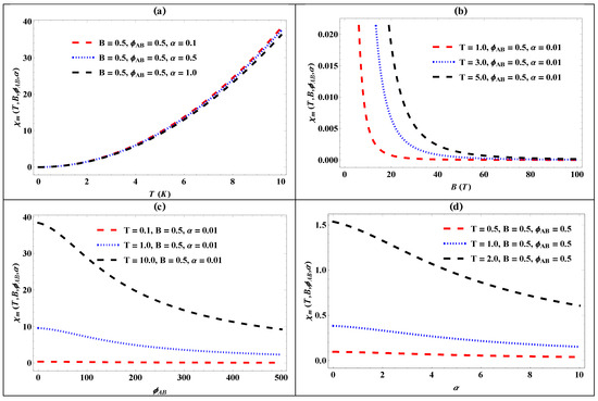 The plot of magnetic susceptibility for the generalized pseudo-harmonic oscillator against (a) temperature for different values of the screening parameter (); (b) the magnetic flux for different values of the screening parameter (); (c) the AB flux () for different values of the screening parameter (); and (d) the screening parameter () for different values of temperature ().