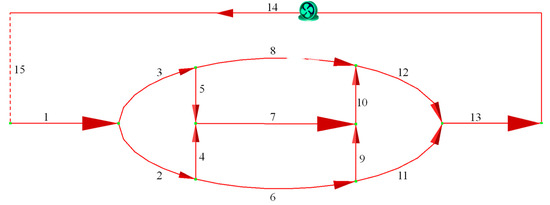 where is the objective of optimal regulation location, is the weight coefficient for this objective, is the number of branches of the ventilation network, and is the regulation level of the branch . A positive value, and the larger it is, indicates that the branch cannot be increasing resistance regulation. A negative value, and the smaller it is, indicates that the branch cannot be increasing energy regulation or decreasing resistance regulation. The regulation level is determined by the mine ventilation engineer based on the roadway properties and its adjustability.