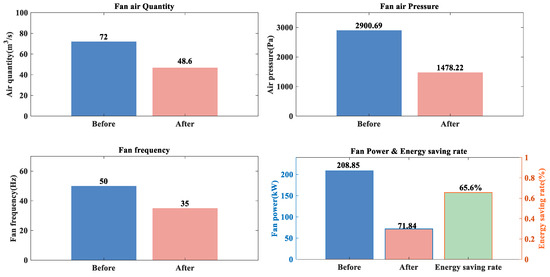 The power of the main fan in the current mine ventilation system is 208.85 kW, operating at a frequency of 50 Hz. By applying the method proposed in this paper, the optimized power of the main fan is reduced to 71.84 kW, with a frequency of 35 Hz, resulting in a 65.60% energy saving. As can be seen from Figure 5, in the final ventilation network regulation scheme, all regulation locations are located in the original regulation roadways. This means that there is no need to add new regulators to ensure underground safety, and the regulators in the existing 18 regulation roadways are sufficient for complete network optimization. This approach not only reduces the number of regulators requiring maintenance and upkeep by eight, but also significantly lowers the energy consumption and costs associated with regulating the ventilation network.
