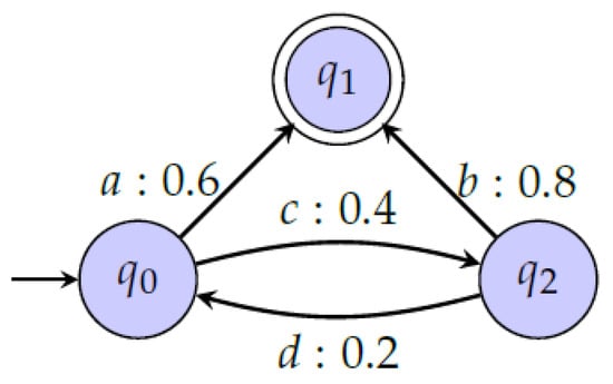 As shown in Figure 1, , Σ, δ, , is a DFPA with and , where is double-cycled. The evaluation of the probability distribution ρ of the events in G is represented by the number immediately following each event. For instance, edge exiting from state indicates that the probability of event a occurs at state is , i.e., for all , if there exists a state such that , then holds. For example, given a string with , the probability of generating from is .
