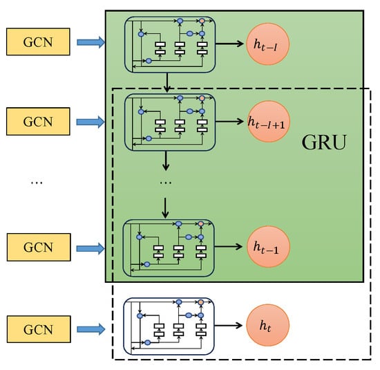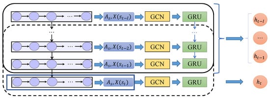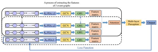 The GRU model computes a hidden state based on the previous hidden state as input. The computation expressed by Equations (7)–(10) is diagrammatically shown in Figure 7, where ⊙ represents the multiplication of the corresponding elements of matrices. The process of using our GRU model is shown in Figure 8, and the whole process of combining GCN and GRU is shown in Figure 9. Due to the two gates and the candidate hidden state, the GRU model retains the changing trend of the occurrence features of historical event-graphs when capturing the function f’s. Therefore, this GRU model can extract dynamic time-varying features. Namely, the GRU model is introduced in our research to learn the temporal correlation features of the occurrences of the events. The features obtained through the GRU model can be applied to an attention model to calculate attention scores. The attention model assesses the degree to which features deserve to receive more attention and then increases the weight coefficient of . The attention model is introduced as below.
