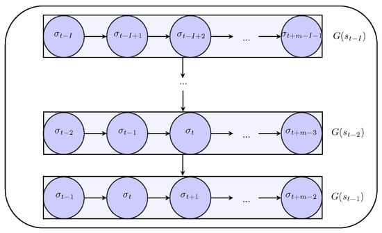 In other words, we use a DFPA G as a source of event-graph sequences , which forms the PDES dataset. In fact, we do not have the structure of the DFPA G in the experiments, while only the event sequence is captured. Therefore, we call this DFPA G a hidden DFPA G. To form the PDES dataset, let us consider the hidden DFPA G in Figure 11 with inital state . We have and . Every eight events’ features form an event-graph by Definition 3. If , , the event-graph feature vector of each event-graph is defined as . The PDES dataset consists of 39,991 ’s.