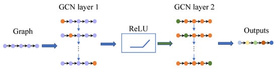The basic idea of a GCN is to average a graph’s neighboring features (including itself) and then pass them into linear layers (linear combination of inputs and weight matrices). The topological relationship between vertices and adjacent vertices on the event-graph is based on the GCN model. Thus, the spatial correlation features of is obtained. The obtained matrix is the essence of a GCN model, and then can be brought into Equation (4) to compute a two-layer GCN model, as shown in Figure 6. After the spatial correlation features of the event-graph composed of the event sequence are extracted by the GCN, the cyber-attack detection model further recognizes the structure of the DFPA by computing the temporal correlation features of these event-graphs. We can choose the GRU to extract the temporal correlation features of the event-graphs.