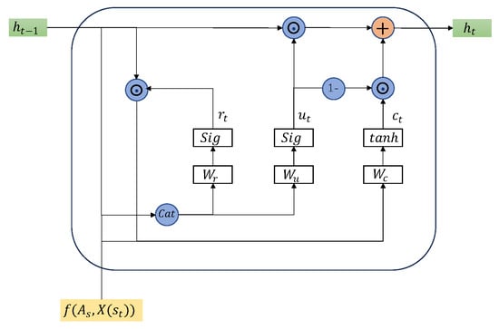 The GRU model has two gates and a candidate hidden state: one gate is an “update gate”, and the other is a “reset gate”. The update gate is responsible for determining the relative weight between a previous hidden state and a current input by employing an activation function. Its output is a value matrix which governs the extent of the hidden state influenced by the previous hidden state. The reset gate controls the fusion between the previous hidden state and the current input. It assists in deciding which historical information is discarded and which is retained. We define the specific operational steps of the GRU model as: