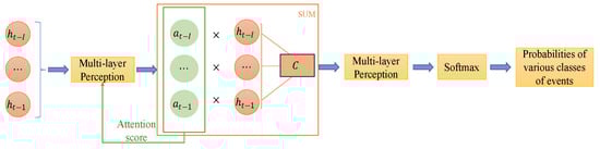 More specifically, given a finite number of hidden states , let be the sequence of the hidden states, denoted by . Our goal is to more accurately predict the occurrence probability of various events in the next time step, and this weight coefficient reflects how much a hidden state can contribute to the accuracy of our prediction goal in its corresponding . Then, we use the attention score function computing each hidden state’s attention score, which can be understood as a weight coefficient of importance about a prediction target in (Equation (11)). To facilitate the subsequent calculations, the normalized attention scores are obtained by normalizing using the Softmax function; see Equation (12).