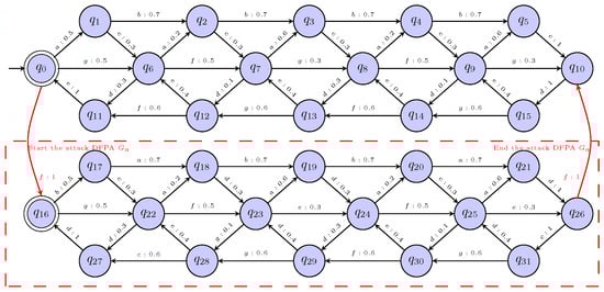 Considering the requirement to evaluate the effectiveness of the cyber-attack detection model for optimization, we construct an attack DFPA , as shown in the red dashed box in Figure 11. To form a dataset attacked by the attack DFPA , we replicate the structure of the DFPA G to the attack DFPA , with the same number of observable and unobservable events. It is assumed that the attacker has complete knowledge of the structure of the hidden DFPA G and have stolen the privileges of the initial state and the state in DFPA G, which means the attacker can enter and return to the DFPA G without being observed in and , respectively. By enabling the unobservable event f in the initial state , the attacker can induce the DPFA G into the designed attack DFPA . The attacker can also stop the attacks at state in the attack DFPA and return to the state in the DFPA G by enabling the unobservable event f.