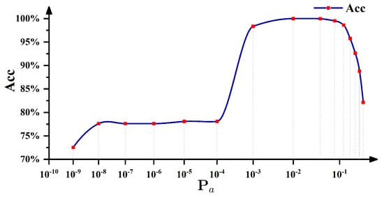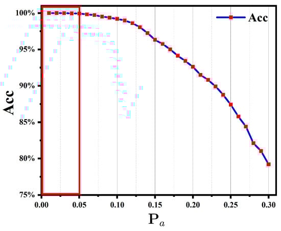 In both datasets, the PDES dataset and the attacked dataset, we utilize the same cyber-attack detection model. The cyber-attack detection model can detect events in the PDES dataset as normal events, and events that were tampered in the attacked dataset as attacked events. First, our cyber-attack detection model must ensure that all attack-tampered events generated by DFPA can be detected, since the attack-tampered events are more dangerous for a PDES system, and then ensure that normal events generated by DFPA G are correctly identified as normal events. The above description ensures the usability of the cyber-attack detection model. In the following subsection, we analyze all the possible attack-tampered events in DFPA by enumeration. Here, we need to first analyze the relationship between the attack threshold and the accuracy rate in the PDES dataset. As shown in Figure 12, the contents of the red rectangular box represent when , the accuracy of the cyber-attack detection model reaches over in the PDES dataset, which means that almost all the events in the DFPA G are correctly predicted under this probability threshold. In particular, when , the accuracy reaches in the PDES dataset. Moreover, the relationship between the attack threshold and the accuracy rate in our attacked dataset is shown in Figure 13. From the results obtained, it becomes evident that a decrease or increase in the threshold value of leads to a corresponding decrease in the accuracy rate . In order to impose a more stringent constraint, the probability threshold is set to in the subsection.
