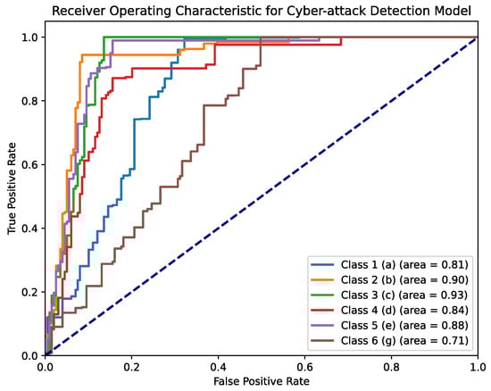Beyond accuracy, we have also evaluated the overall performance of the cyber-attack detection model using receiver operating characteristic (ROC) curves, as shown in Figure 14. The ROC curves illustrate the model’s ability to differentiate between different event categories. The model addresses a six-class classification task, where the occurrence probability of each event is computed to further determine whether the event has been tampered. The area under the curve (AUC) values range from 0.71 to 0.93, indicating strong performance across most event categories, with Class 3 (c) achieving the highest AUC value of 0.93.