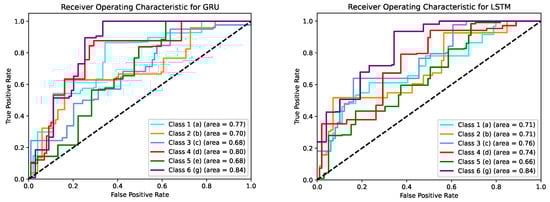 The overall performance of the proposed cyber-attack detection model is summarized by the average F1-score and weighted F1-score, which are 0.7049 and 0.8126, respectively. The weighted F1-score considers the support of each event category, making it a more reliable measure of performance, particularly in scenarios with imbalanced class distributions. These metrics indicate that our model not only maintains high accuracy but also achieves balanced performance across all event categories. To further validate the effectiveness of the model, we have compared it against models using GRU or long short-term memory (LSTM) [19] alone. Both GRU and LSTM models are trained under the same experimental settings, and their ROC curves are illustrated in Figure 15, highlighting the advantages of our approach.