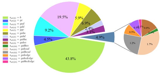 Specially, if an event sequence is attacked, then an observable string starting from the first event of to the first-tampered event of is contained in . In this example, each attacked category of the attack DFPA is contained in , since is the set of all preceding strings of attack-tampered event sequences generated by the attack DPFA . For instance, the string represents a category of event sequences with event g as the starting event and event d as the first attack-tampered event. The percentages of each event sequence () of the attacked dataset are shown in Figure 16.