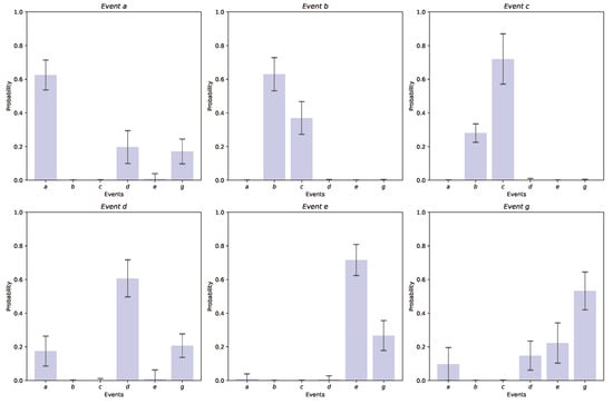 Within each subplot (Figure 17), the height of the bars represents the average predicted probability for that event as the true next event within the test set taken into account by the model. The error bars represent the standard deviation of the predicted probabilities, providing important information regarding the stability of the prediction distribution. For instance, in the subplot for event c, the model demonstrates a higher predicted probability along with a significant standard deviation, suggesting that the model is indeed confident in predicting this event, albeit with lower consistency in its predictions. Conversely, the subplot for event a indicates lower predicted probabilities, yet higher consistency in the distribution of probabilities, as evidenced by the relatively smaller error bars.