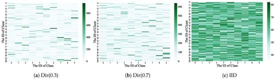 Visualization of Non-IID property in federated learning (FL). (a–c) Dirichlet (Dir()) label-based imbalanced partitioning on 100 clients with the CIFAR-10 (Dir(0.3)), CIFAR-10 (Dir(0.7)), and CIFAR-10 (IID) datasets, respectively. Each row represents a client, and the color of each rectangle indicates the number of data samples of a particular class belonging to a client. Dark green signifies a high quantity, while light green indicates a low quantity.