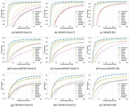 Test accuracy of different federated learning algorithms under three data partitioning methods on the MNIST, FashionMNIST, and CIFAR-10 datasets. (a–c) Results on the MNIST dataset under three heterogeneous data environments: IID, Dir(0.3), and Dir(0.7). (d–f) Results on the FashionMNIST dataset under three heterogeneous data environments: IID, Dir(0.3), and Dir(0.7). (g–i) Results on the MNIST dataset under three heterogeneous data environments: IID, Dir(0.3), and Dir(0.7).
