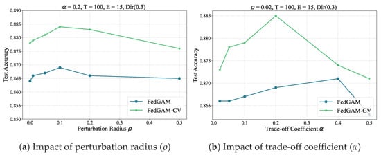 Test accuracy of FedGAM and FedGAM-CV on FashionMNIST under different perturbation radii and trade-off coefficients. (a) Test accuracy under different perturbation radius (). (b) Test accuracy under different trade-off coefficient ().