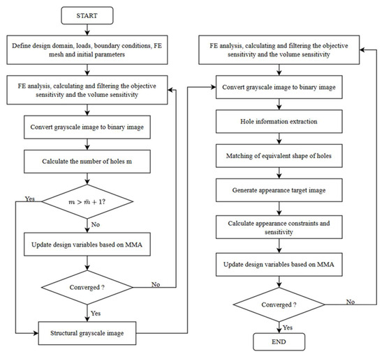 The proposed topological optimization algorithm with appearance function constraints integrates image processing techniques, equivalent shape measurement matching algorithms, hole interference handling methods, hole filling strategies, and appearance function constraints simultaneously. The flowchart of the hole appearance constraint method proposed in this paper is depicted in Figure 1. The proposed algorithm takes the classical topology optimization approach with the judgment of the hole number as the first stage of optimization and the optimization process with the appearance function constraint as the second stage, in which the gray image of the 2D design obtained in the first stage is the initial value of the second stage of optimization.
