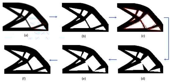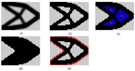 The element does not belong to the boundary set B if the result of the convolution operation is ; otherwise, it belongs to the boundary set . In order to judge the elements on the boundary of the design domain, this paper uses a 0 element to expand the design domain, and finally obtains the boundary of the closed solid area, which is represented by the red element in Figure 2d.