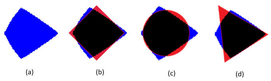 where represents the area of the equivalent isosceles triangle as depicted in Figure 4 d in the red region; the overlapping area between the original shape and its equivalent isosceles triangle is illustrated in Figure 4d by the black section.