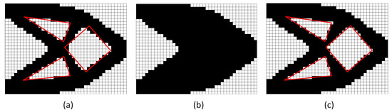 This paper employs the fire-burning method (FBM) [20,36] to extract information about the holes from the binary image, including the hole number and the element set of each hole. The FBM can obtain multiple subdomains from a discrete design domain based on element adjacency information and properties (the density of elements), with each subdomain containing elements of the same density and each subdomain singly connected. The specific steps are as follows: Identify all elements with a density of 0 within the design domain Ω, and then divide all void elements into multiple void subdomains based on adjacency relationships (four adjacency). Subsequently, all hole subdomain information is obtained by eliminating the void subdomains adjacent to the design domain boundary. We use , to represent the element set of all holes, where m represents the hole number. The Figure 2c shows the information of the number of holes and all elements contained in each hole in the structure extracted by the FBM, including three holes represented by , where .