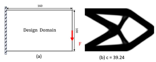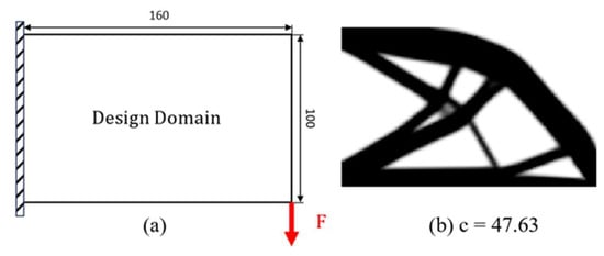 The cantilever beam problem illustrated in Figure 11a uses a design domain divided into 160 × 100 elements; the final design volume fraction is constrained to 0.5, with a filter radius of 3. The left edge of the design domain is completely fixed, and an external force is applied at the midpoint of the right edge. The control parameter k for the minimum distance between holes is set to 1, and there is no constraint on the maximum number of holes, with set to a large value (for example, ). The appearance constraint is set to , where corresponds to the appearance function associated with the structure in Figure 11b.