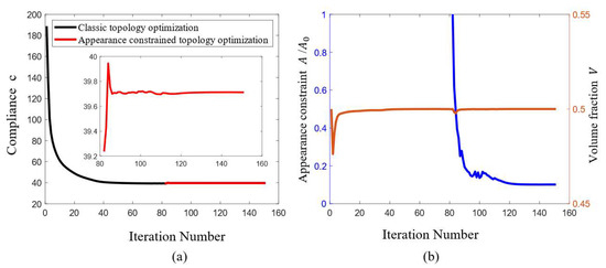 The change in compliance, volume fraction, and appearance constraint during the iteration process. (a) The change in compliance changes during the iteration process. (b) The change in volume fraction and appearance constraint during the iteration process. The blue line represents the volume fraction, and the orange line represents the appearance constraint.