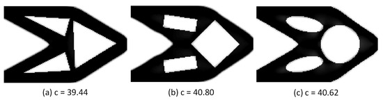 The classical topology optimization results are displayed in Figure 20b. After introducing an appearance constraint represented by = , the optimized results are depicted in Figure 20c. In this example concerning the MBB beam, when calculating the shape appearance target image, we applied a hole interference control strategy too. We set the control parameter for the minimum distance between holes as k = 1. The hole interference control strategy to address the interference between holes led to gradual filling of the holes at the bottom-left and bottom-right corners during the optimization process.
