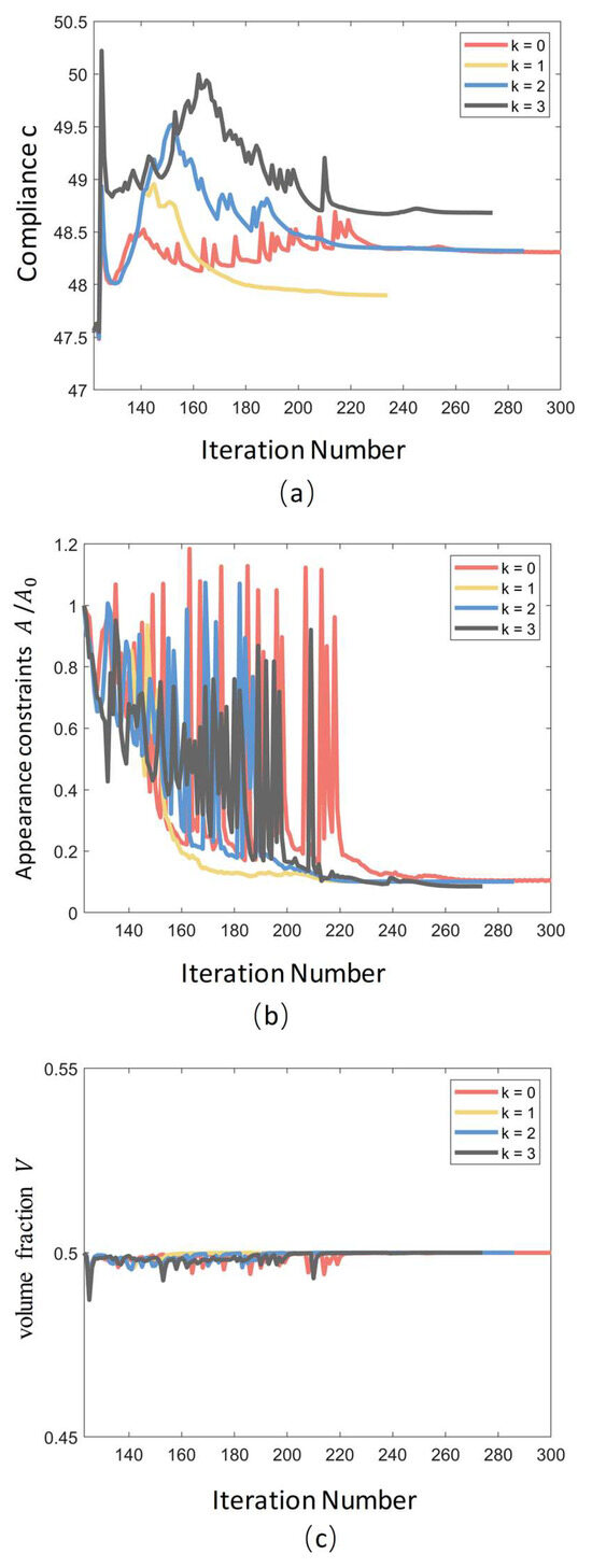 The change in compliance, volume fraction, and appearance constraints during the iteration process. (a) The change in compliance during the iteration process when k takes different values. (b) The change in volume fraction during the iteration process when k takes different values. (c) The change in appearance constraints during the iteration process when k takes different values.