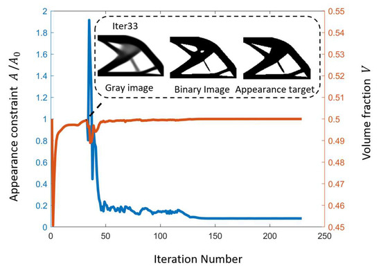 Volume fraction and appearance constraint during the iteration process for . At the 33rd iteration, the number of holes reaches 4, and the optimization process transitions into the second stage, where appearance constraint is applied. The blue line represents the volume fraction, and the orange line represents the appearance con-straint.